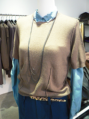 ベージュの半袖ニットを重ねて着て