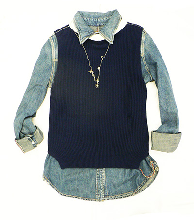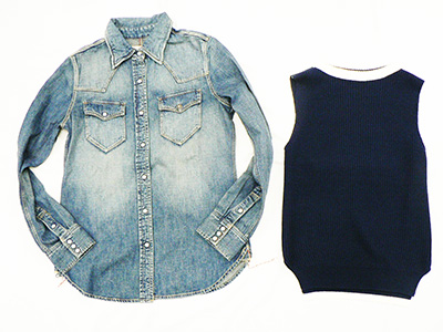 デニムシャツ + ネイビーニットベスト
