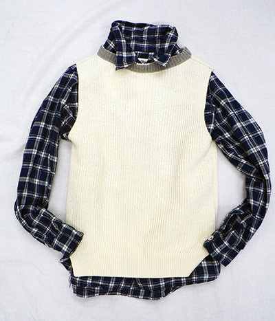 チェックシャツ + ホワイトニットベスト