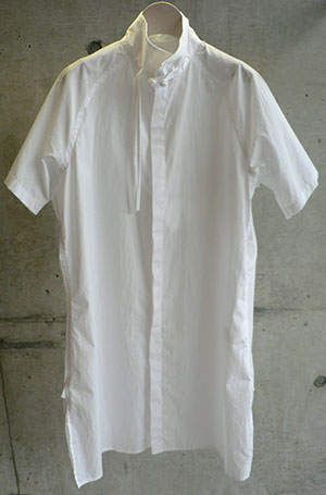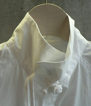チャイナっぽい衿が個性的な白なロングシャツ。