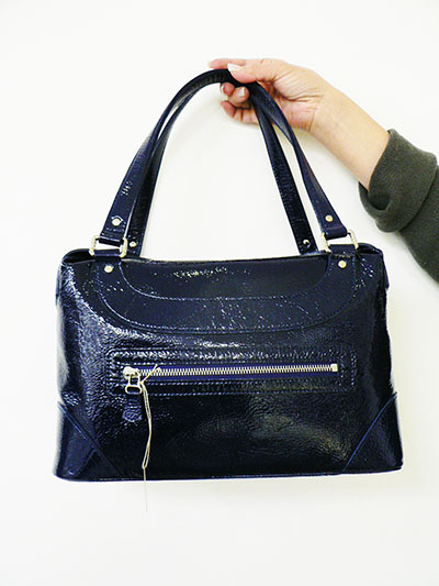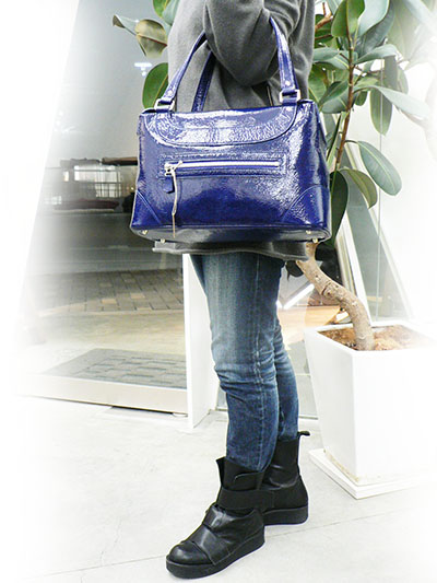 しわ加工したカーフレザーをエナメルコーティング。
