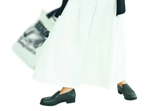 洗練されたフォルムのローファーで洒脱に引き締め。