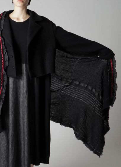 縮むウールの糸と、チェック部分の縮まないアクリル混部分の差でフリルの様になっています。