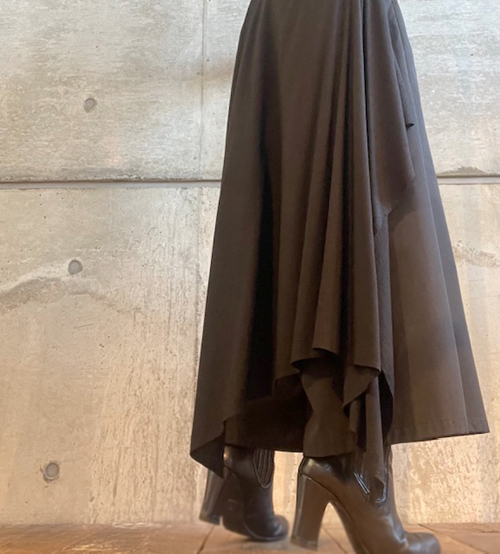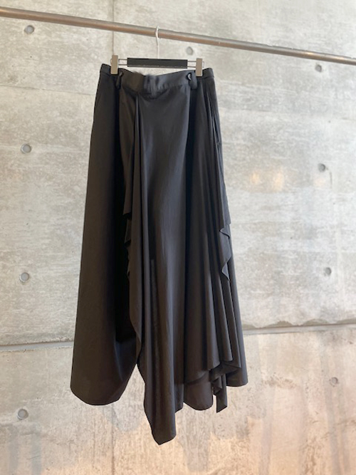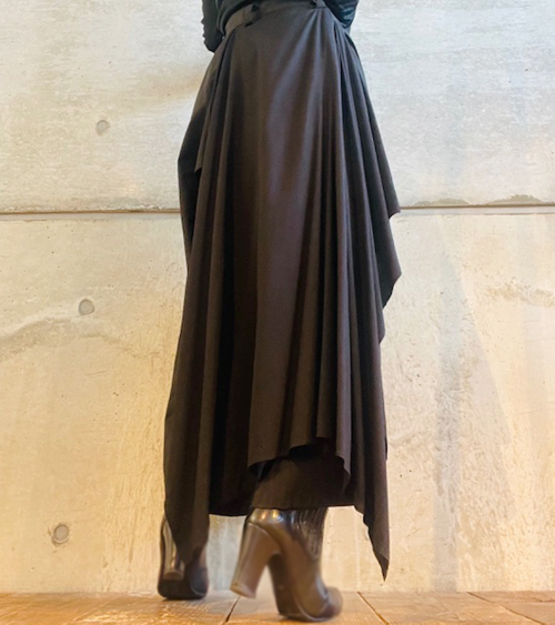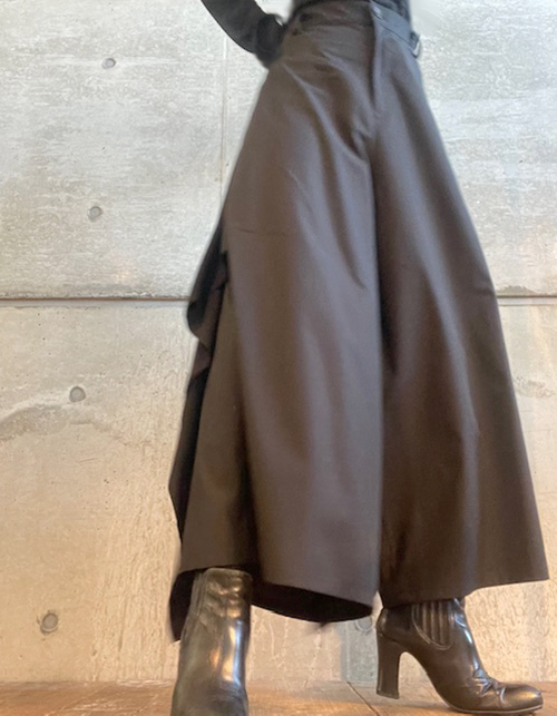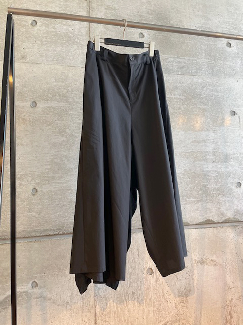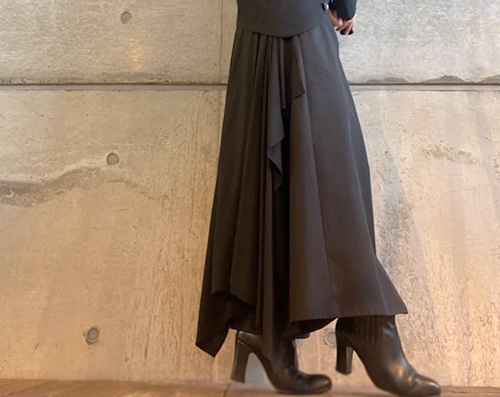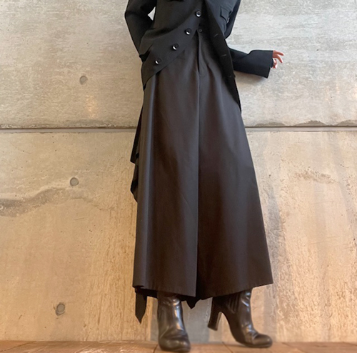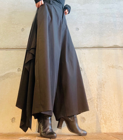 バックサイドドレープの効いた黒のパンツ