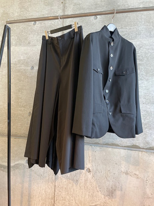 スタンドカラーのジャケットですが、襟を開いてテーラー風にもお召しいただけるので