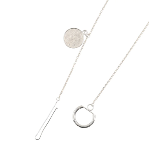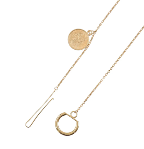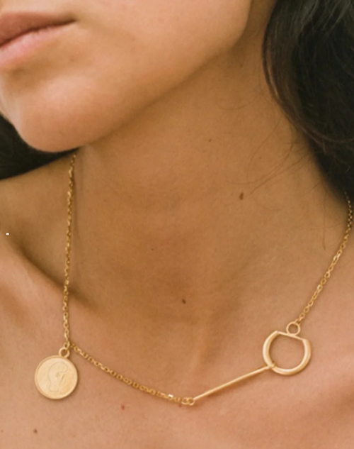 リングモチーフとバー、そしてコインチャームが絶妙に組み合わさり、アートピースのような印象