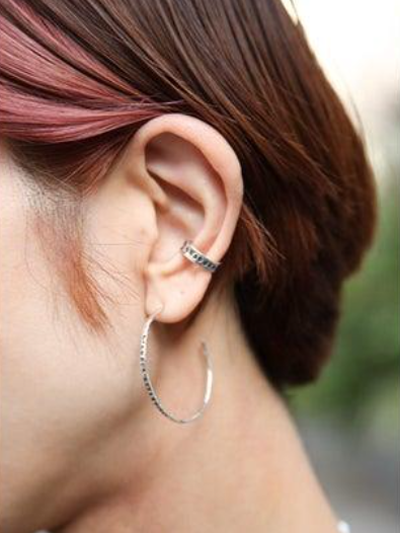 大きめのフープに存在感のあるイヤカフでメリハリのつくコーディネート