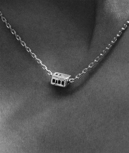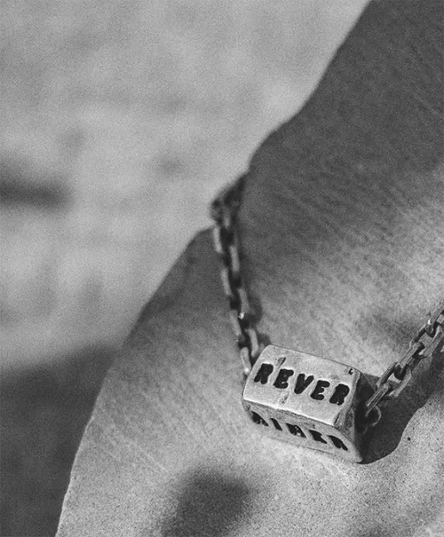 デザイナーが大切にしている3つの言葉が動きのあるキューブ型のチャームに刻まれています。