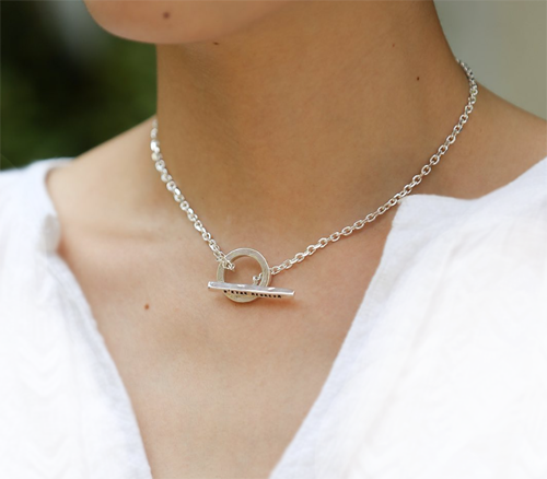 太めのチェーンと個性的なデザインのトップで甘さを抑えたネックレス
