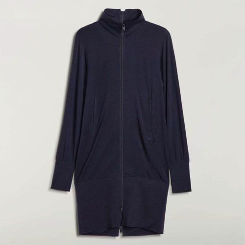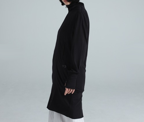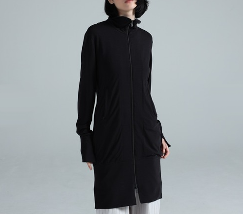 デュアルジップ構造のロングシルエットが、モダンな印象を演出する。