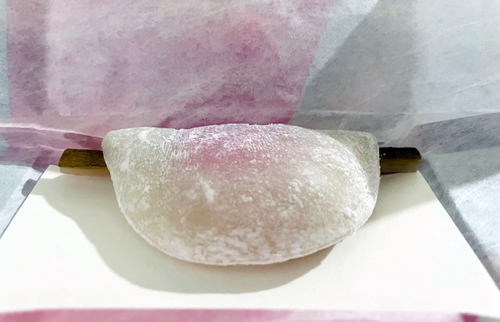 ほんのり紅色が透ける羽二重餅で、白みそ餡と 柔らかく蜜づけしたごぼうを包んだ