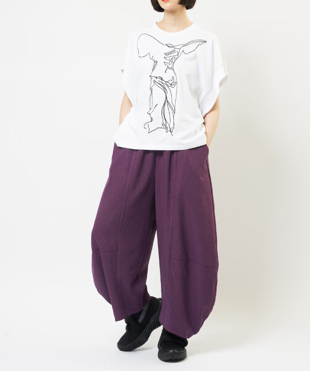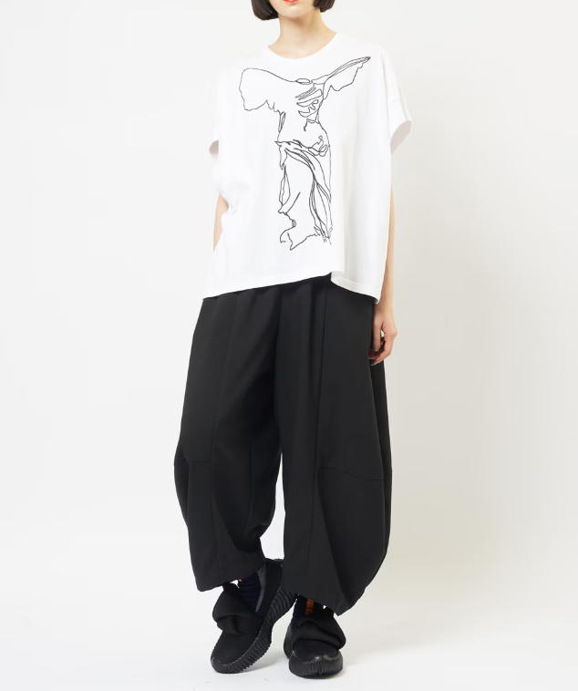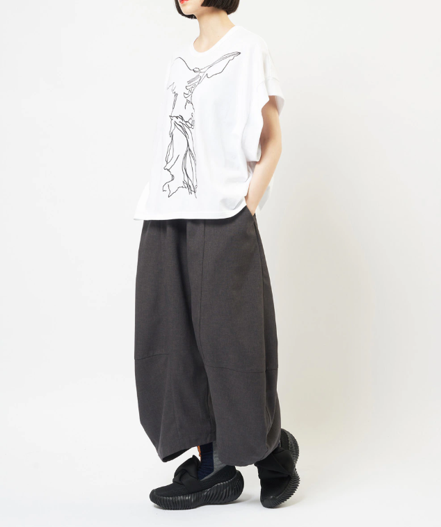少しデザインのあるトップスを合わせるとモードなスタイルに
