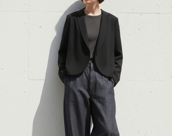 すっきりとしたシルエットでジャケットやニットとのレイヤードのスタイリングにもおすすめ。