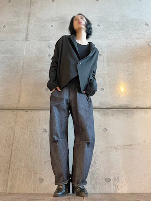 内側にタックを施し緩くカーブを描いた様なシルエットが特徴。