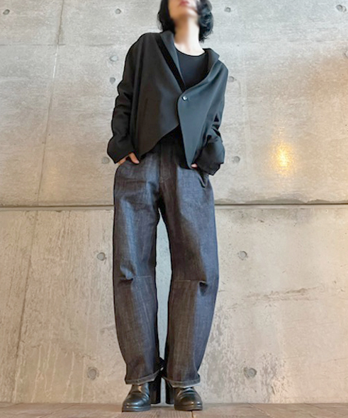 内側にタックを施し緩くカーブを描いた様なシルエットが特徴。