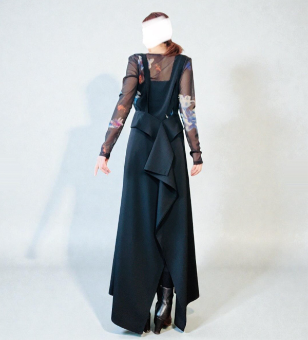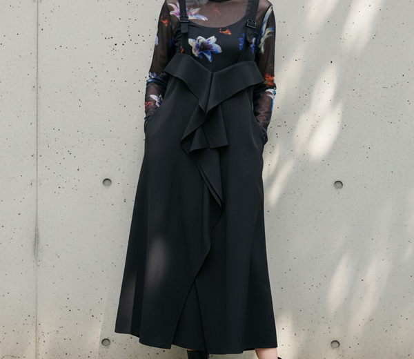 前後にドレープを感じるデザインの吊りスカート