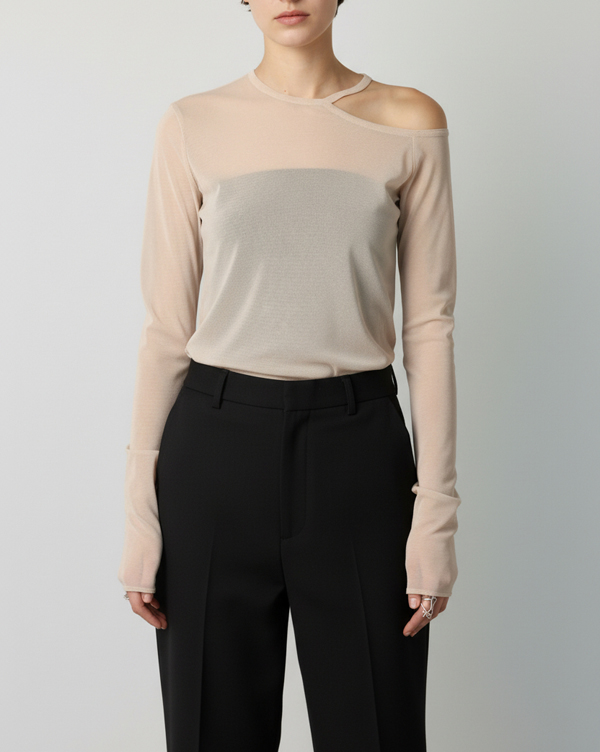 肩出しデザインのカットソーは、片側のみの肌見せでヘルシーな印象でお召しいただけます。