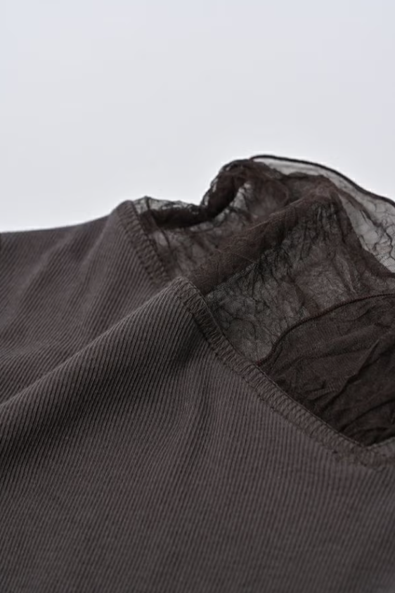 リブ生地とクラッシュメッシュの切り替えで生まれる、さり気ないシアー感。