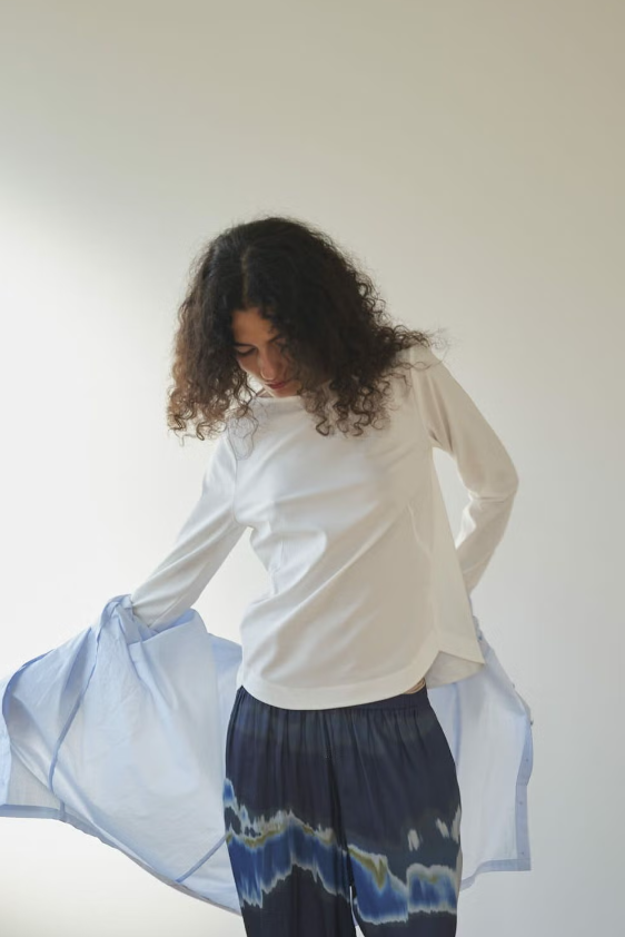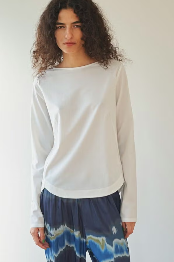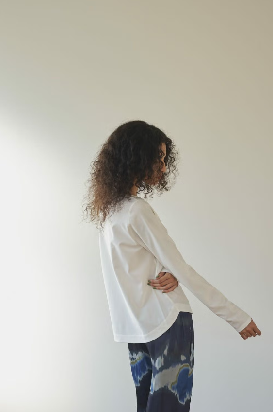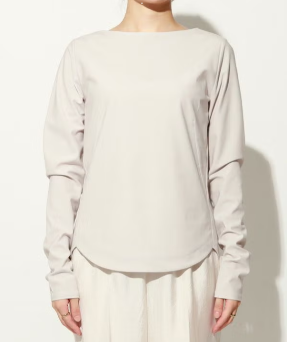 首元を美しく惹き立てるネックラインや、パンツインしやすい裾カーブ