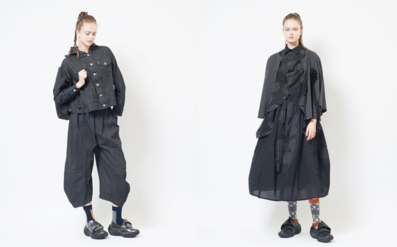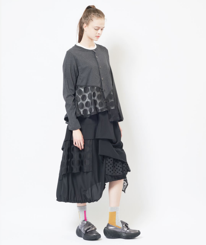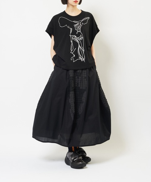 ふんわりとしたスカートシルエットと配色によって奥行きのある印象に
