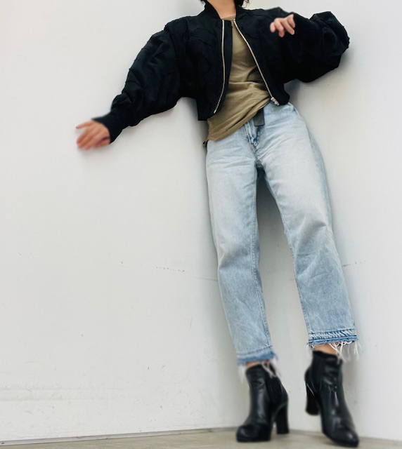 コンパクトな着丈が視線を上に引き上げ、腰位置を高く見せてくれるため、自然とスタイルアップを叶えます