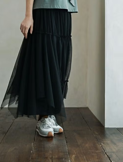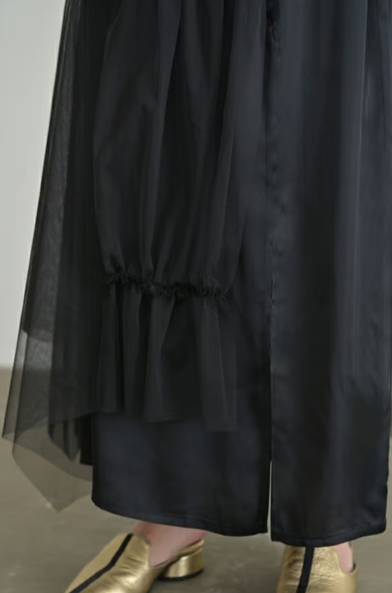 チュールは、イレギュラーな切替えとギャザーを組み合わせることで、立体的に動きをつけ、計算された程よいアンバランスな仕上がりに。