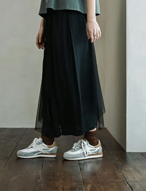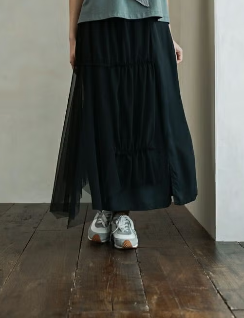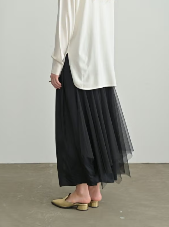 ツヤ感のある薄手素材とハリ感のあるチュールの組み合わせが大人モードなデザインスカート