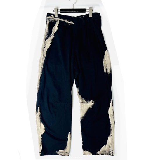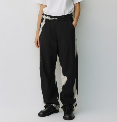 深みのあるブラックのデニム生地に刷毛で脱色を施しています。