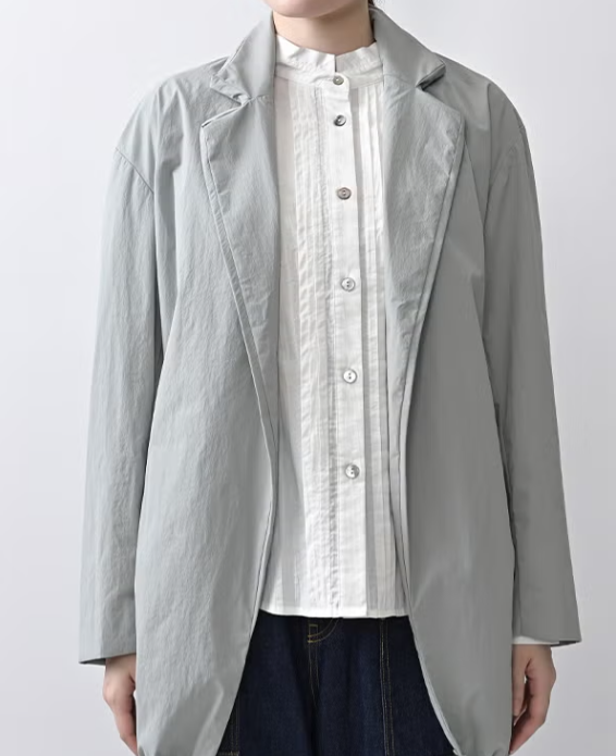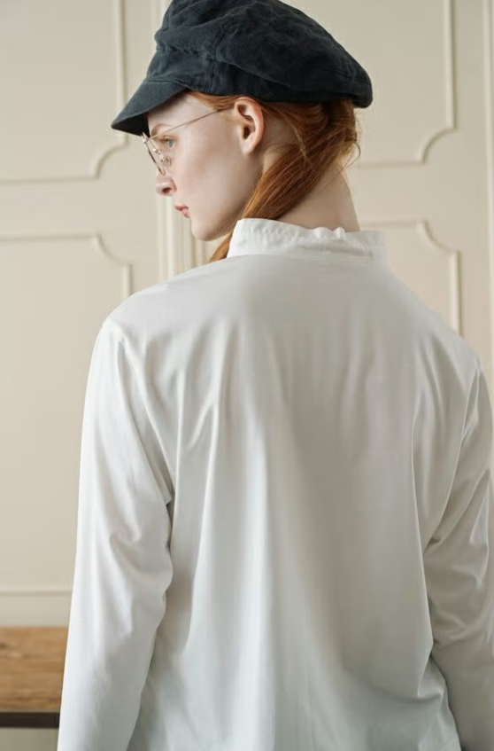細いスタンドカラーは襟元をきちんと見せ