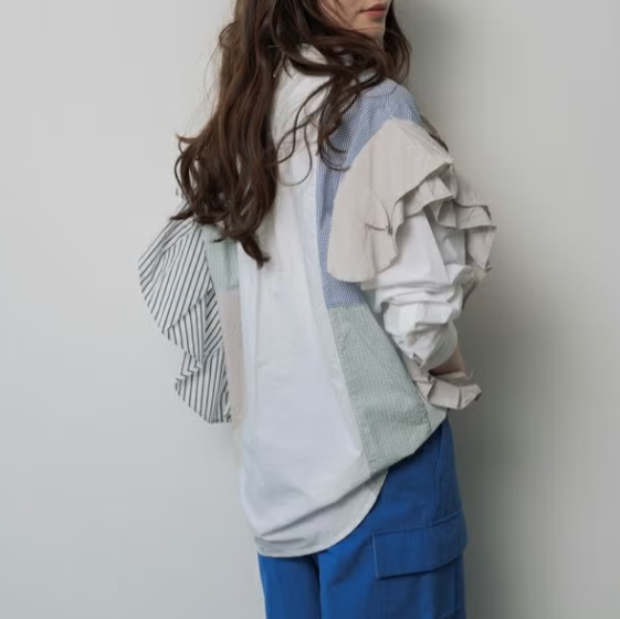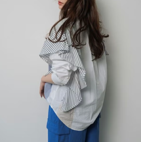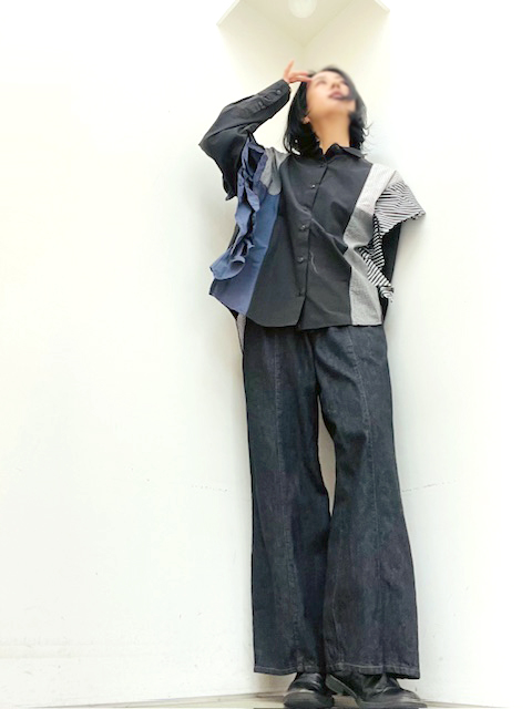 肩先からストンと落ちる位置からのフリル + 製品洗いで、甘く見えがちな印象を大人カジュアルに仕上げた一枚。